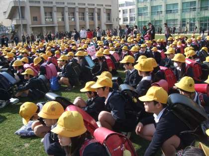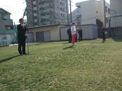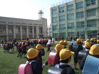 運動場で人数確認後、校長先生や城東消防署の署員の方からのお話を聞きました。