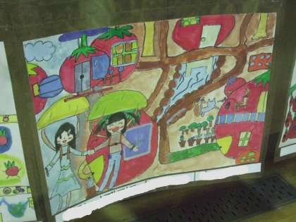 「この建物をトマトでかこう!」「ここはトマトの葉っぱで表そう!」たくさんの楽しそうな声が聞こえてくるような作品に仕上がりました。