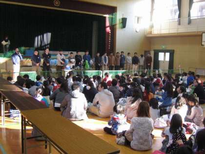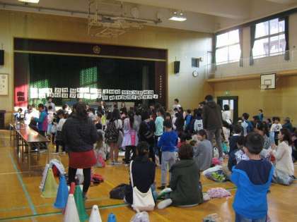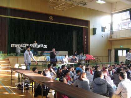 第1部の実験・工作タイムが終わり、お世話になった大阪工業大学の方々にお礼をいいました。そしてPTA会長さん、校長先生の話を聞いた後、子どもたちが楽しみにしているお待ちかねの第2部のビンゴ大会が始まりました。