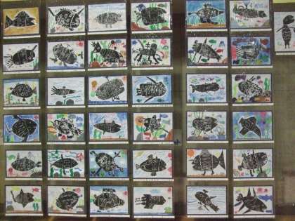 1つ目は「ふしぎな魚」です。紙版画で自分たちの考えた不思議な魚を表現しました。