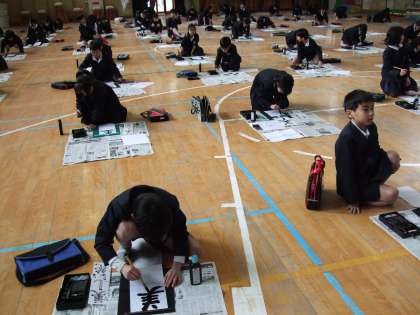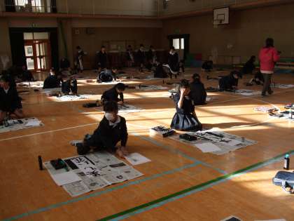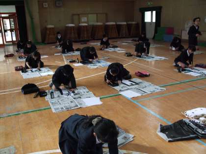 普段の机の上に半紙を置いて筆を動かすのとは、少し勝手が違うようでしたがきちんと正座をして真剣に「美しい花」と書いていました。