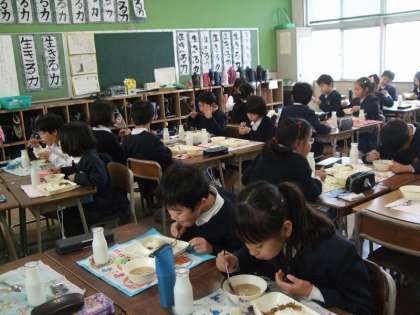 久しぶりに友達と食べる給食は、とてもおいしいそうで一生懸命