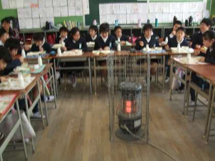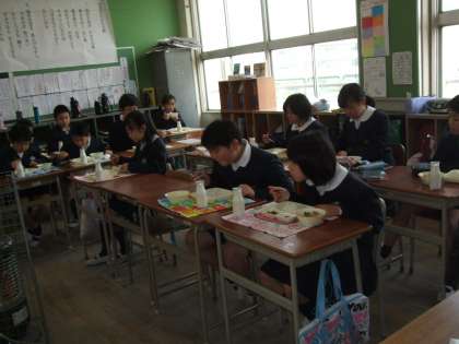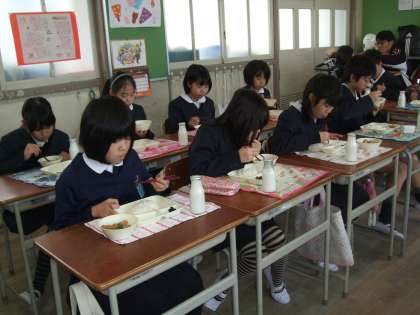 たくさん入れて配られたおかずも足りないようで「いただきます」の