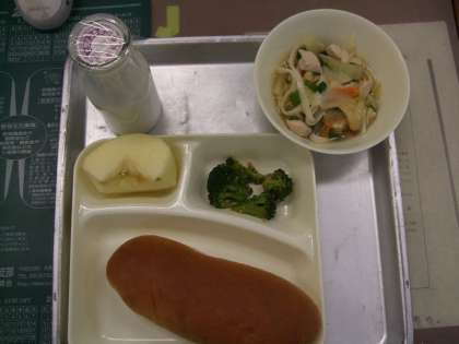 きょうの献立は、五目うどん・ブロッコリーのごまあえ・りんご・