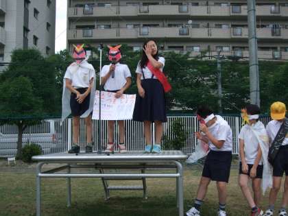 あいさつをいっぱい広げて「関目小学校を明るくしたい」という思うがつのり、10日児童朝会で全校児童の前であいさつをしようと呼びかけてくれました。あいさつレンジャーが出動したりポスターを貼ったりしてみんなに「あいさつの大切さ」を教えてくれるそうです。