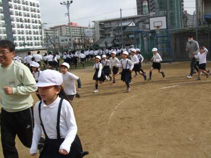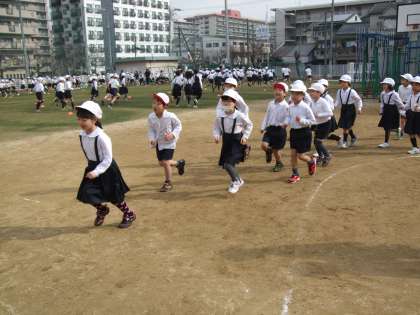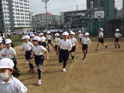 体調の良くない児童は、赤帽をかぶって内側をゆっくり歩きます。