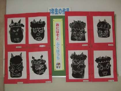 かわいい鬼が並んでいます。紙版画で作成しました。