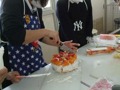 きれいにでき上がったデコレーションケーキを緊張しながら切り分け