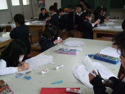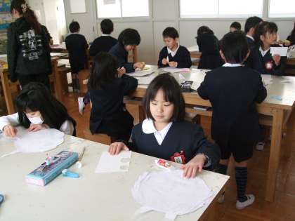紙版画の版作りを図工室でしています。