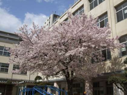 今日は学級写真を各クラスで撮りました。きれいな桜を背景に、1年生から写真を撮っていきました。雨が心配されましたが、本当によかったです。