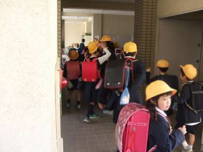 今日の5時間目は、全学年で分団会がありました。各分団で、登校時の確認と自己紹介を行いました。1年生は、6年生のお兄さん・お姉さんに迎えに来てもらって、それぞれの教室に行きました。分団会後は、分団ごとに下校を行いました。列に並び、それぞれの集合場所を確認して、家に帰りました。明日からこの分団・集合場所で登校します。