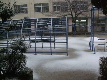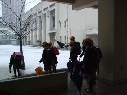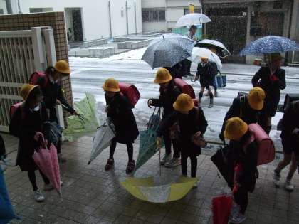 子ども達も興奮気味です。傘に積もった雪を払ったり、雪の運動場をながめたりと、いつもと違う登校風景です。