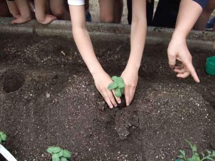 2年生はミニトマトなどいろいろな植物を植えました。ししとうやオクラなどの植物は2年生の学習園に、自分の植木鉢にはミニトマトを植えました。みんな「おいしくなーれ」と祈りながら水をあげました。夏に向けて大きく育ってほしいですね。