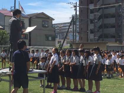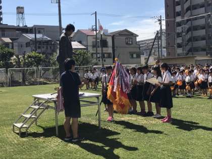 今日の全校朝会にて、優勝旗、賞状、優勝カップ、メダルを校長先生から表彰していただきました。