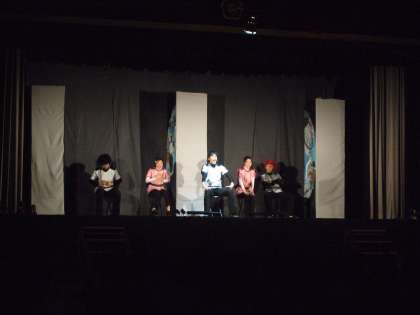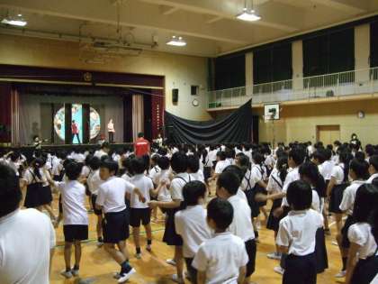 1年生から6年生が集まり、前半はミュージカル・パフォーマンス『スクラップ』を見ました。この舞台は、観客と一体になって、作るもので、子どもたちも手拍子や足踏みなどでリズムをとりながら楽しんでいました。この舞台からは、ものを大切にしてほしいという願いを感じました。
