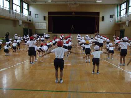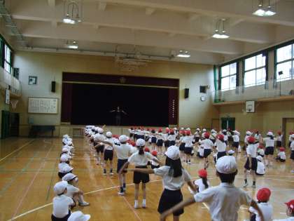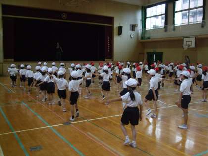 1年生、2年生が合同で、プールに向けてアヒル体操をしました。2年生は現在の3年生に教えてもらったように、1年生の前で見本を見せていました。その後、合同でアヒル体操を何度か練習しました。この体操を通して、水を楽しんでプールの授業ができるといいですね。