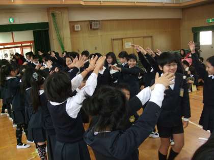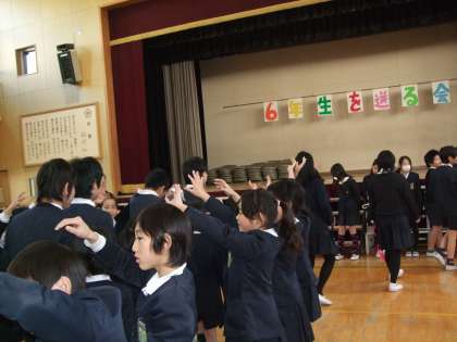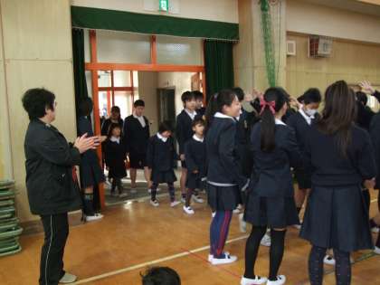 まず、2〜5年生が待つ会場へ1年生と手をつないだ6年生が