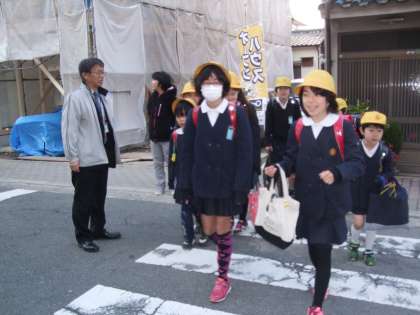 今朝は、新しい班長が先頭にたって歩き、6年生は後方から班を見守って