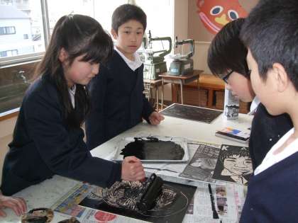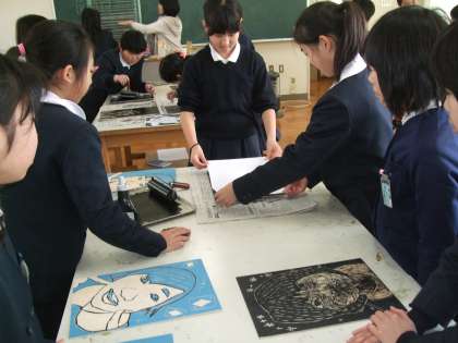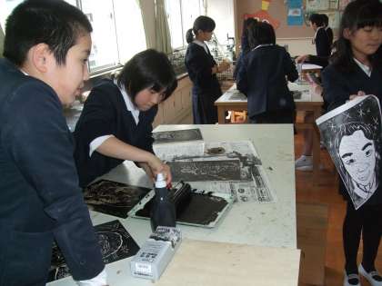 木版画で「自画像」に取り組みました。顔の表情をつけるために