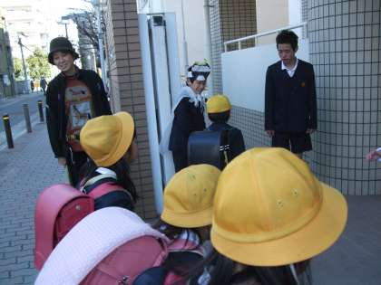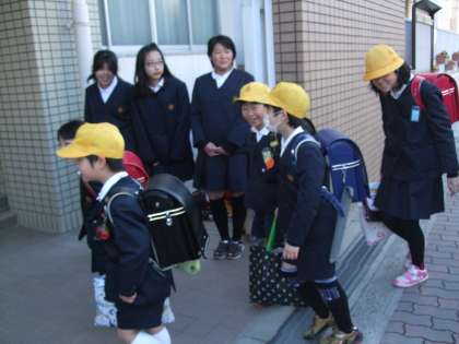 卒業を1週間後に控えた6年生が、忙しい中朝のあいさつを校門で行っています。