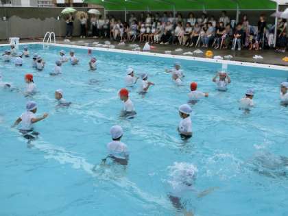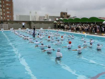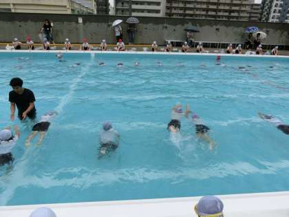 あやまって水に転落したとき、落ち着いて行動できるようにするために、普段と着衣しているときとの違いを体験しました。いつもなら簡単に泳げる距離が、服を着ていると思うように動くことができないことに児童は驚いていました。また、水による事故を防ごうとする意識も高まった時間となりました。