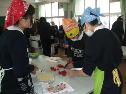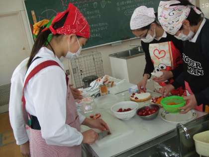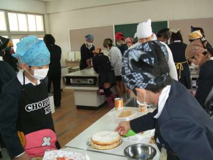 包丁も上手に使って班で協力して、ホールのスポンジにホイップクリームを