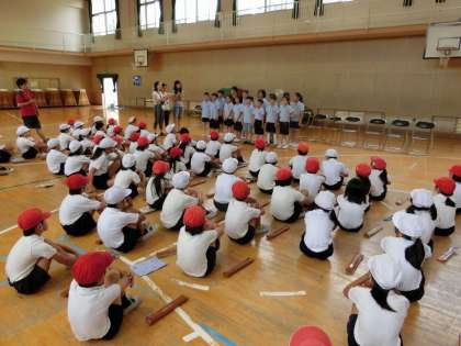 到着後、4年生から歓迎セレモニーを行いました。お互いのあいさつの後、関目小学校からは出し物として、歌とリコーダー演奏、上海からの学校からは演奏と歌、そして日本の空手の型を披露しました。