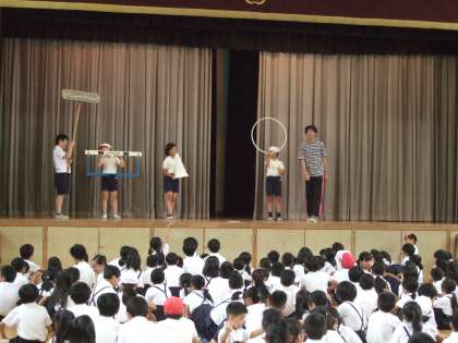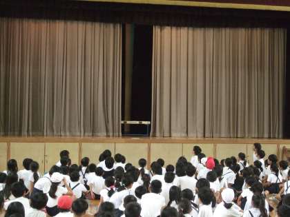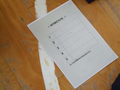 今日の児童集会では、カーテンの間を通ったものを当てるというゲームをしました。全部で5問あり、各班で、グループごとに話し合って紙に書いていきます。みんなが集中して取り組むことができていたので、たくさん正解することができていました。