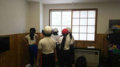 その後、部屋割りを行い、午後からの活動であるフィールドアスレチックに備えて着替えました。避難訓練で安全経路を確認した後は、フィールドアスレチックです。