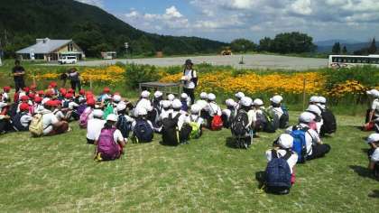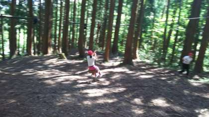 フィールドアスレチックの説明を聞いた後、グループごとにコースを回っていきます。ちょっと怖そうなものもあれば、すぐにやってみたいと思うものあり、児童は思い切り体を動かしています。ハチ高原も暑いとのことですが、木陰では涼しいようです。