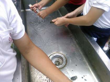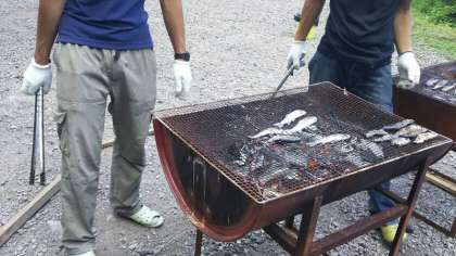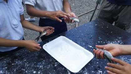 捕まえた魚は自分たちで洗い、塩をふり、炭火で焼いていただきました。