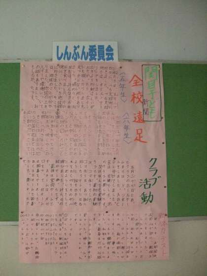 毎月の委員会活動で記事の内容や構成を話し合います。記事の内容を考えるのは、むずかしいようです。原稿を分担して子どもの目線から学校行事などの記事を書いていきます。各自が書き終えれば模造紙に貼って仕上がりです。給食室横の掲示板に貼り出していますのご覧ください。