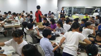いよいよ待ちに待った夕食タイムです。家庭や給食で食べる雰囲気とはまた違う中おいしいメニューがまっていました。