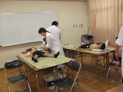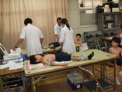 今日は、心臓検診がミーティングルームで行われました。これも1年生にとって初めての検診です。長机をベットに見立てマットの上で横になります。器具を両手・両足・胸に取り付けます。「寝たふりをしていてね〜。」とやさしく声をかけてもらっても緊張してしまいます。「ほら、足を動かさないで。」「手がピクピクしたよ。」つい動いてしまいます(*_*)「は〜い、おしまい。」の声にホッとしてベットから降りる1年生でした。