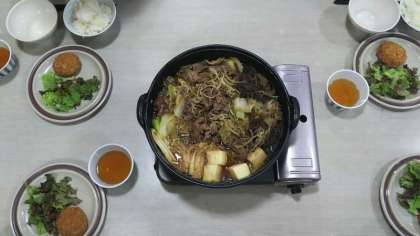 2日目の夕食はすき焼きでした!真ん中にみんなで分け合っていただきました。
