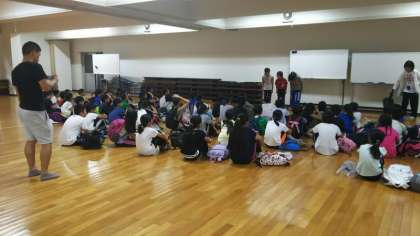朝の集いでは、担当児童の挨拶や校長先生の話を聞きました。その後部屋の荷物をすべて出し、食事係りのあいさつとクイズを行いました。