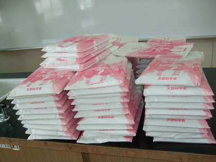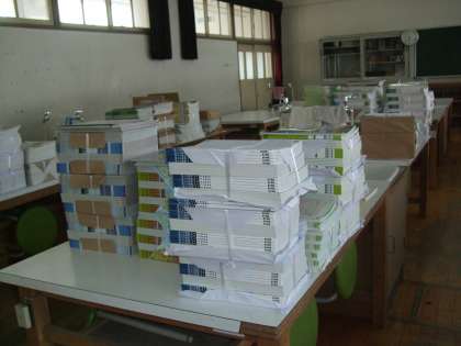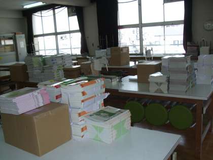 理科室の実験台に高く積まれているのは、平成26年度の教科書です。