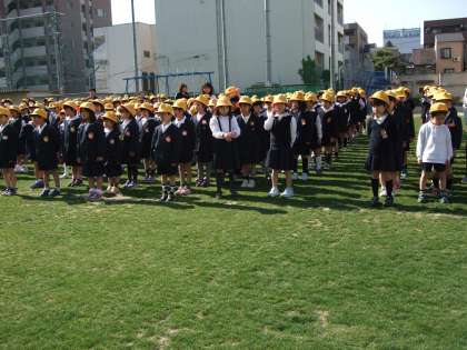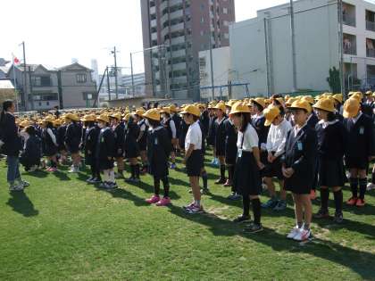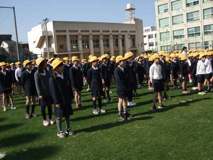 関目小学校では、毎週月曜日の朝全校児童が運動場に集まって朝会を