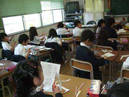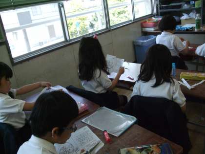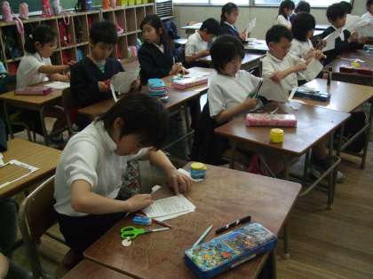 今日2年生の教室では1年生にプレゼントするアサガオのたねをいれる袋を作っていました。去年自分たちがもらったプレゼントでもあるので1年生のために真剣に作っていました。(●^o^●)