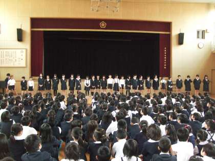 代表委員、学級代表、各委員会の委員長が全校児童の前であいさつをしました。よりよい学校にするためにこれからもがんばってほしいです(●^o^●)
