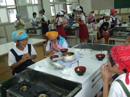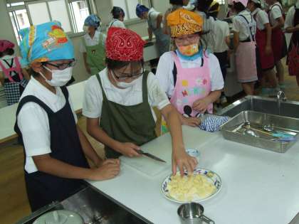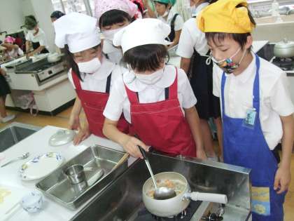 家庭科室からいい匂いがします。5年生の調理実習「ビーフシチュー作り」です。火の通りをよくするためにジャガイモも人参も小さめに切っています。煮込む時間も細かく指導してもらっていました。肉の臭味を取るためにロリエの葉も入れて本格的です。おいしく出来上がりみんな大満足(^。^)