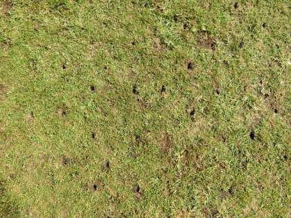 1.コアリング作業…芝生に穴をあけ、古い根や土を抜いていきます。