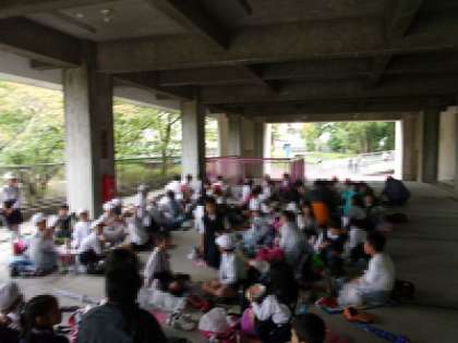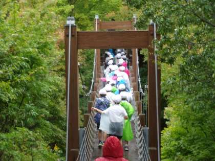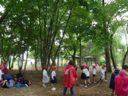 自然観察学習館を出た後はソラード(森の空中観察路)へ行きました。この道は高い位置にあり、高い木々の間を通り抜けていたので、普段とは違った雰囲気で自然を観察することができました。ソラードを歩いた後は再び屋根のある休憩所へ戻り、屋根の下で昼食を食べました。各クラス入りまじり、みんなで楽しく食べることができました。昼食後は、少し自然散策や縄跳びなどを行い、帰路につきました。雨が降ったりやんだりの天気でしたが、楽しく活動することができました。
