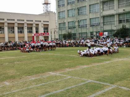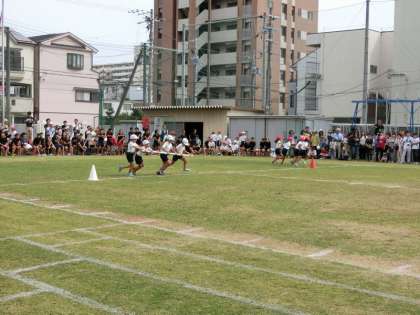 運動会の午後の部で、優勝がかかった最後の点数が入る競技です。チームの協力が必要な競技なので、児童は声をかけながら競技に挑んでいました。