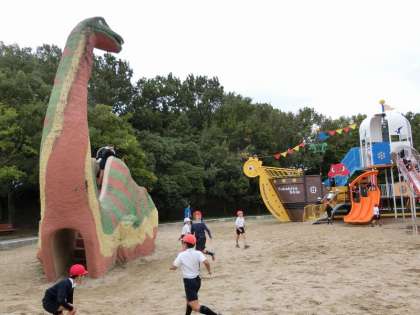 大芝生でお弁当を食べ、その後は恐竜広場で友達とたくさん遊びました。