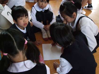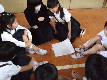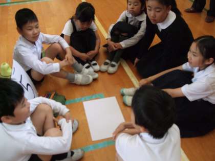 どの班も真剣な話し合いをしており、自分たちの班の旗をつくっていました。