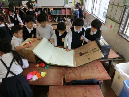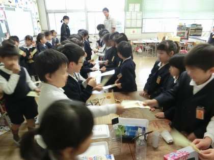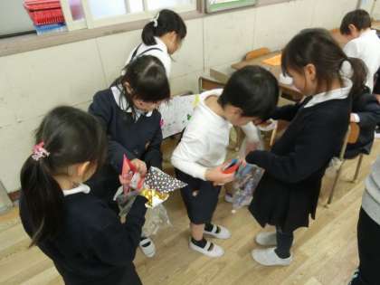 色々なお店を楽しんだ後は1年生からお礼として、きれいな落ち葉を使ったしおりがプレゼントされました。渡す1年生も、もらう2年生も少し照れていましたが、教室が温かい雰囲気に包まれました。