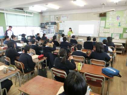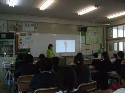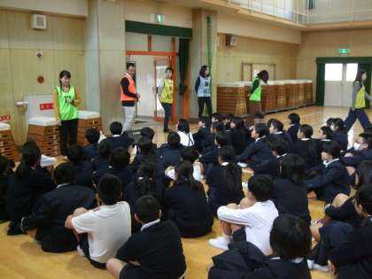 11月17日(金)に、6年生は京都大学生による、救急救命の授業がありました。まず、教室で胸骨圧迫やAEDについて学習を行い、実践するために講堂へ移動しました。講堂で全体指導があり、いよいよ班に分かれて、リレーが始まります。