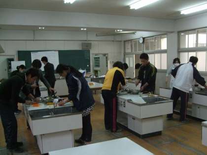 先日、教職員対象の外国人教育研修会を行いました。前半は教室で、韓国・朝鮮との歴史や外国人教育の指導上の視点についての講義がありました。現在、社会的に問題になっているヘイトスピーチについての話もあり、いい学習会でした。後半は、文化にふれるということで家庭科室で、チヂミを作りました。いい出来栄えで、おいしくいただきました。