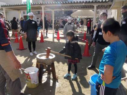子ども用のもちつきコーナーもあり、子どもたちが列に並んでもちつき体験をすることができました。その他にも、ゲームコーナーや消防士体験など子どもたちも楽しめるものがたくさんありました。